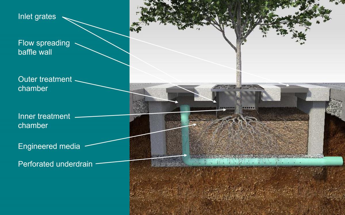 5. Sediment and particulate pollutants are removed as the stormwater makes it way through the engineered filter media while dissolved pollutants will be absorbed through the root system.