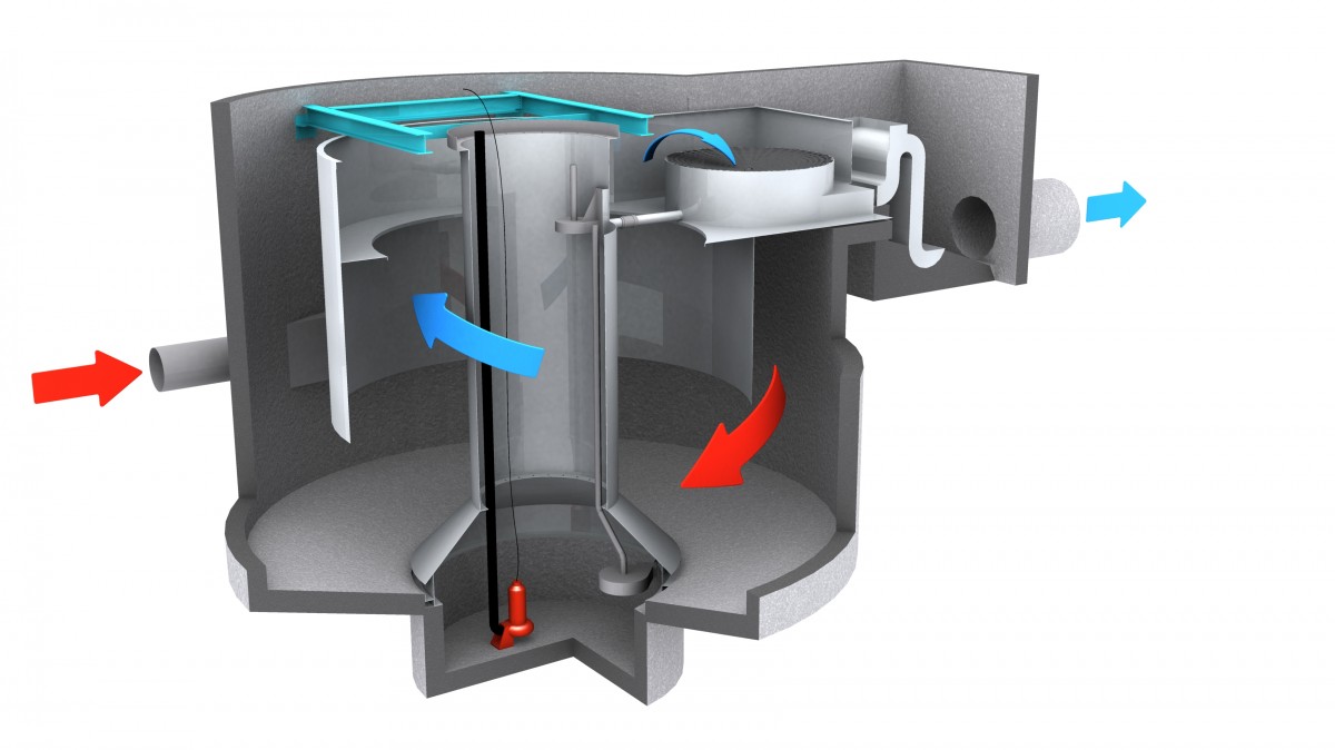Les composants internes dirigent le flux en rotation loin de la périphérie, et vers le centre haut regard sous forme d’une large spirale, tournant plus lentement que le flux entrant en partie basse (flèche rouge). Lorsque le flux atteint le sommet du système, il est normalement libre de solides décantables et il se déverse dans la canalisation de sortie. Avant la surverse, le flux s’écoule à travers le tamis de nettoyage à tourbillon.
